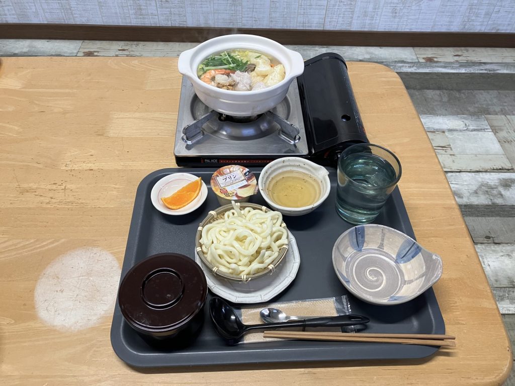 然而,餐點內容只有小火鍋(內含烏龍麵)、白飯、一個布丁、一片橘子,甚至沒有熱茶,只有一杯冷水。